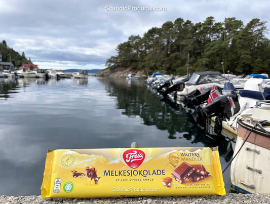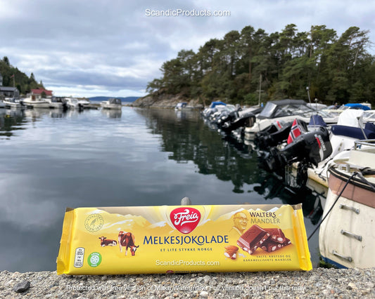 Freia Melkesjokolade Walters Mandler – Milk Chocolate with Walters Almonds 200 grams (7 ounces)